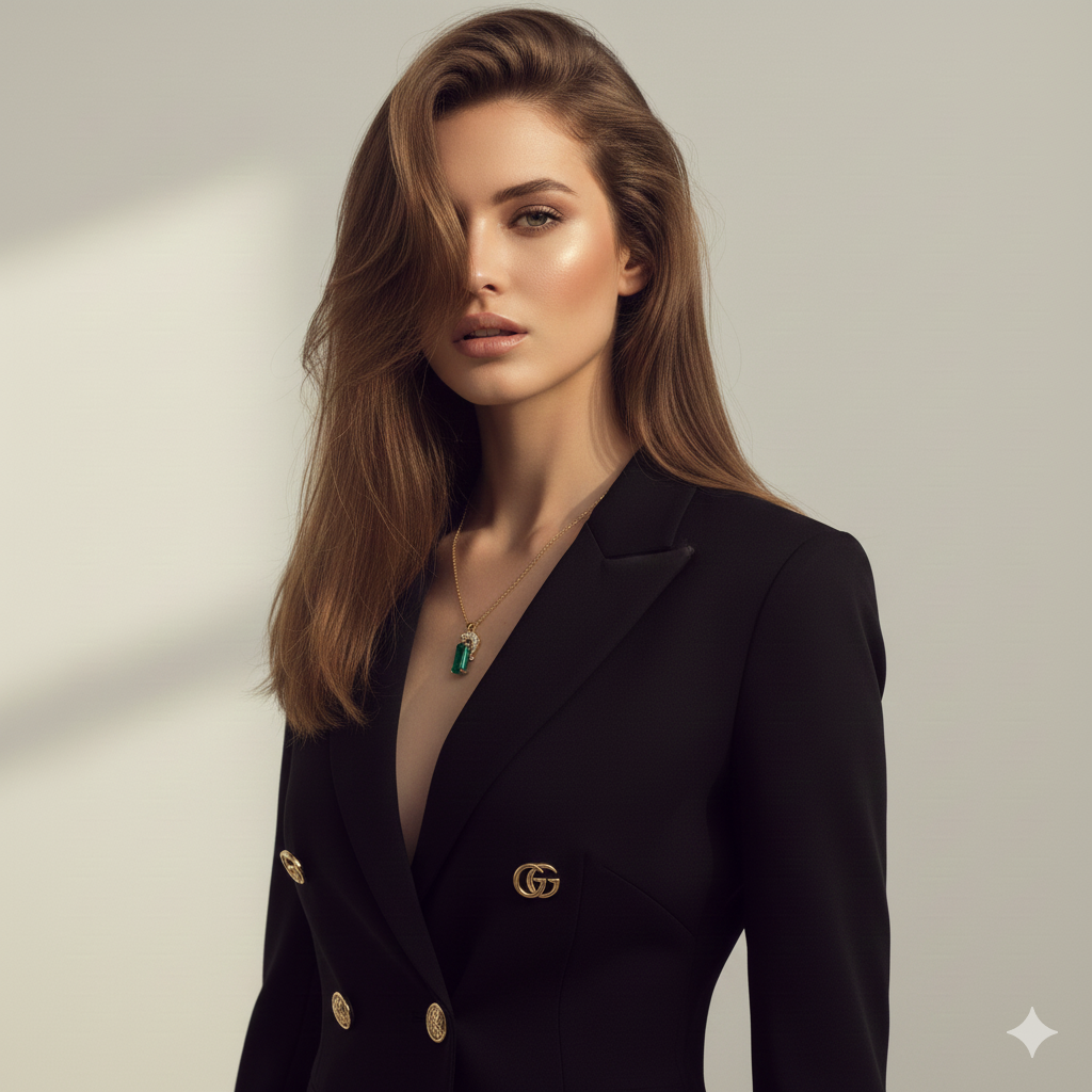 Let the Emerald Panther Elegance Necklace take center stage by pairing it with a deep neckline or an off-shoulder black dress. Complement it with minimal gold earrings or an emerald ring for a cohesive, regal look. For a touch of drama, add a bold red lip ā the ultimate expression of modern sophistication.