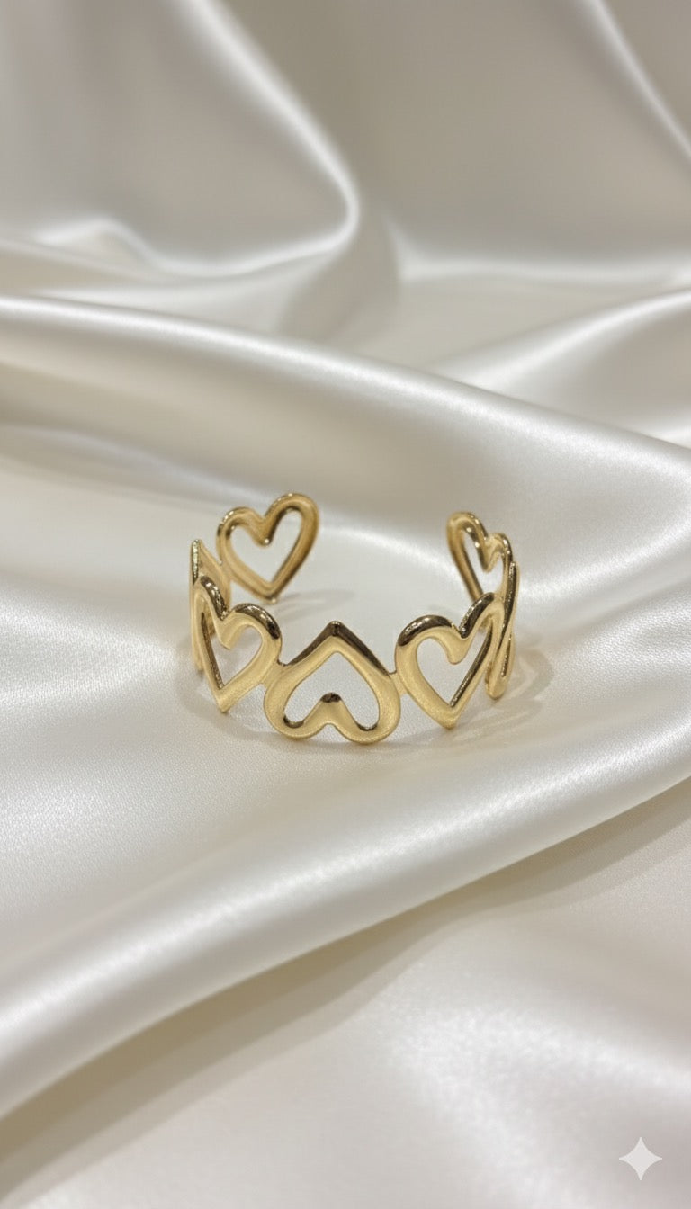 Embrace the elegance of pure romance with the Golden Heart Aura Cuff by Drizzling Stars. Designed with a sequence of open-heart motifs, this bracelet blends softness and sophistication in every curve. Its polished gold finish catches the light beautifully, making it the perfect piece to express charm, love, and effortless luxury.