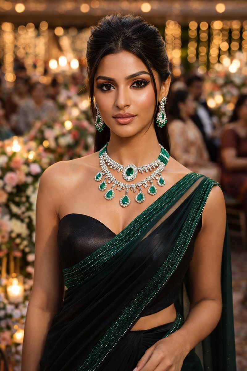 Make a statement of timeless luxury with the Royal Emerald Grace Diamond Necklace Set. Designed with cascading diamond motifs and rich emerald-green stones, this exquisite set blends regal charm with contemporary elegance. The multi-layered necklace is beautifully accented with teardrop emerald drops and finished with fine green bead detailing near the clasp, adding depth and sophistication. Paired with matching statement earrings, this set is perfect for brides and grand celebrations where elegance takes center stage.