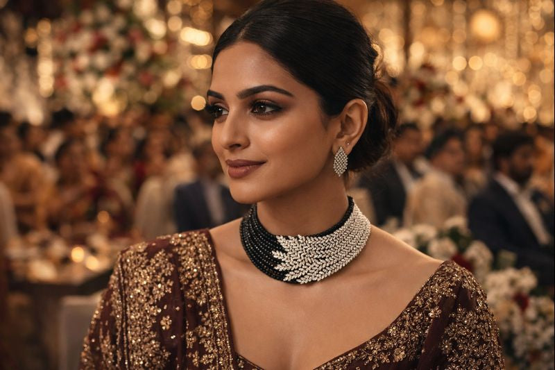 Make a bold statement with this Midnight Leaf Diamond Choker Set, a stunning fusion of modern glamour and timeless elegance. Crafted with precision, this choker features a luxurious black bead base accentuated by a cascading leaf motif encrusted with dazzling white stones, creating a striking contrast that instantly elevates any look.
