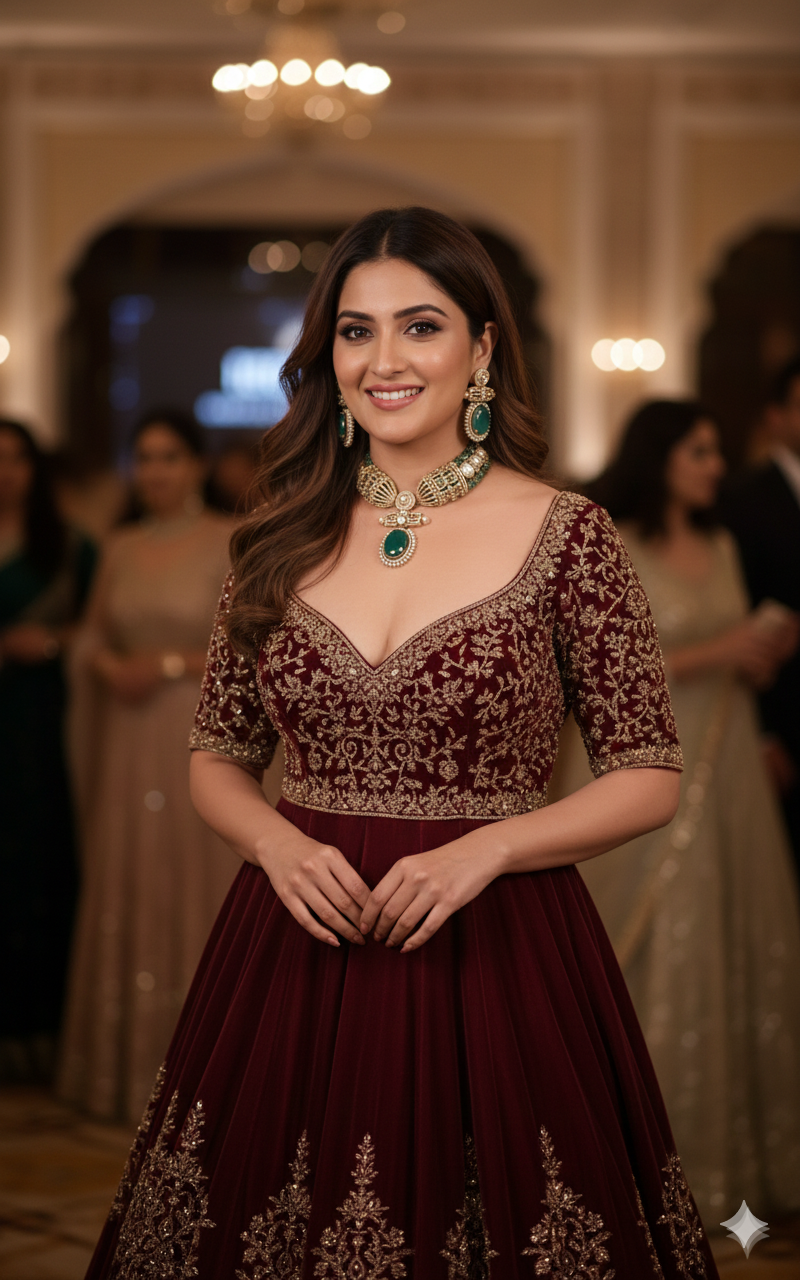Traditional: Pair this with a rich silk Kanjeevaram saree, a velvet lehenga, or a heavy Anarkali suit. The green contrasts beautifully with deep reds, maroons, mustard yellows, and ivory.