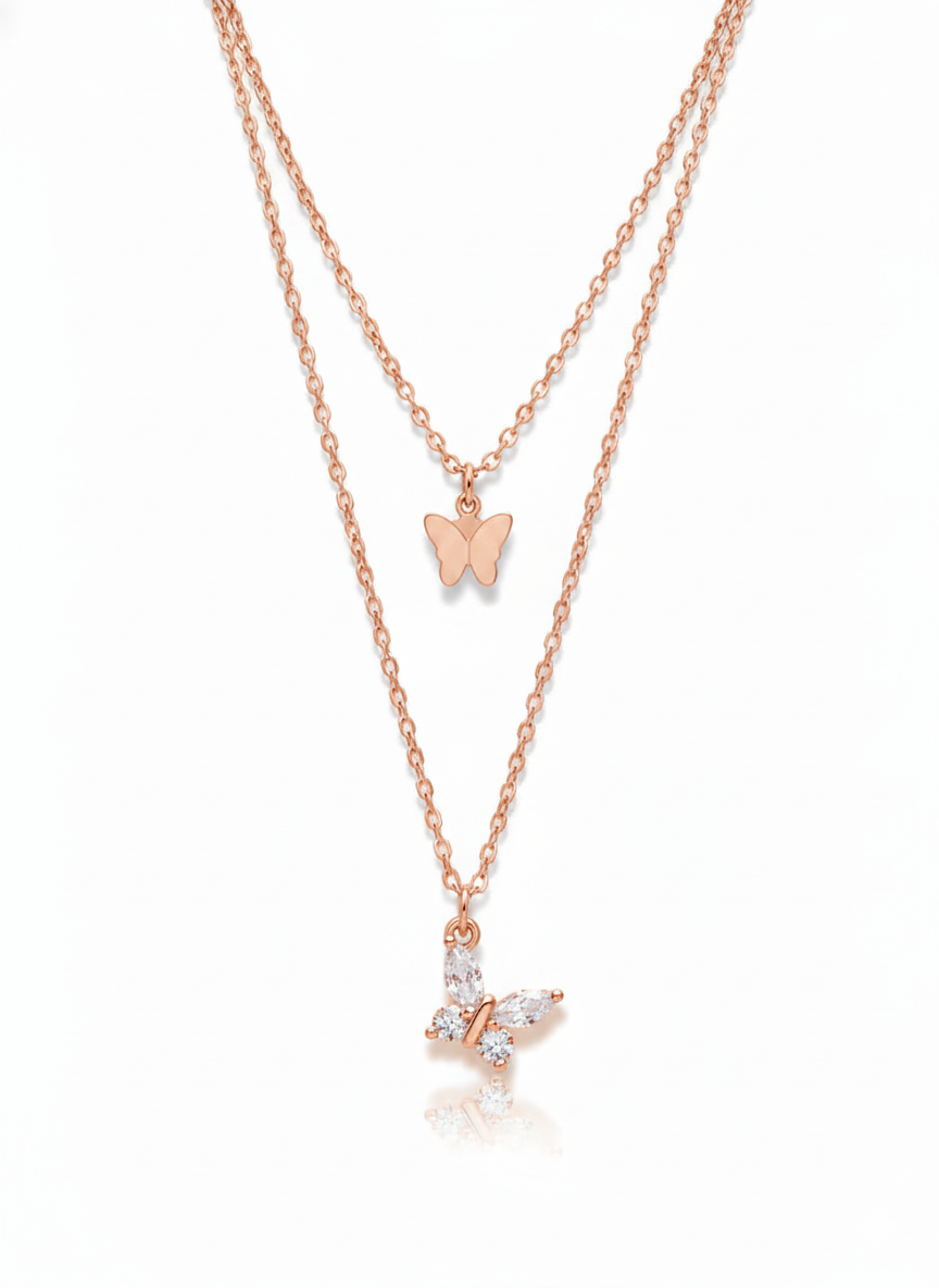 This exquisite necklace features a dual-layer rose-gold chain, each adorned with a delicate butterfly charm.